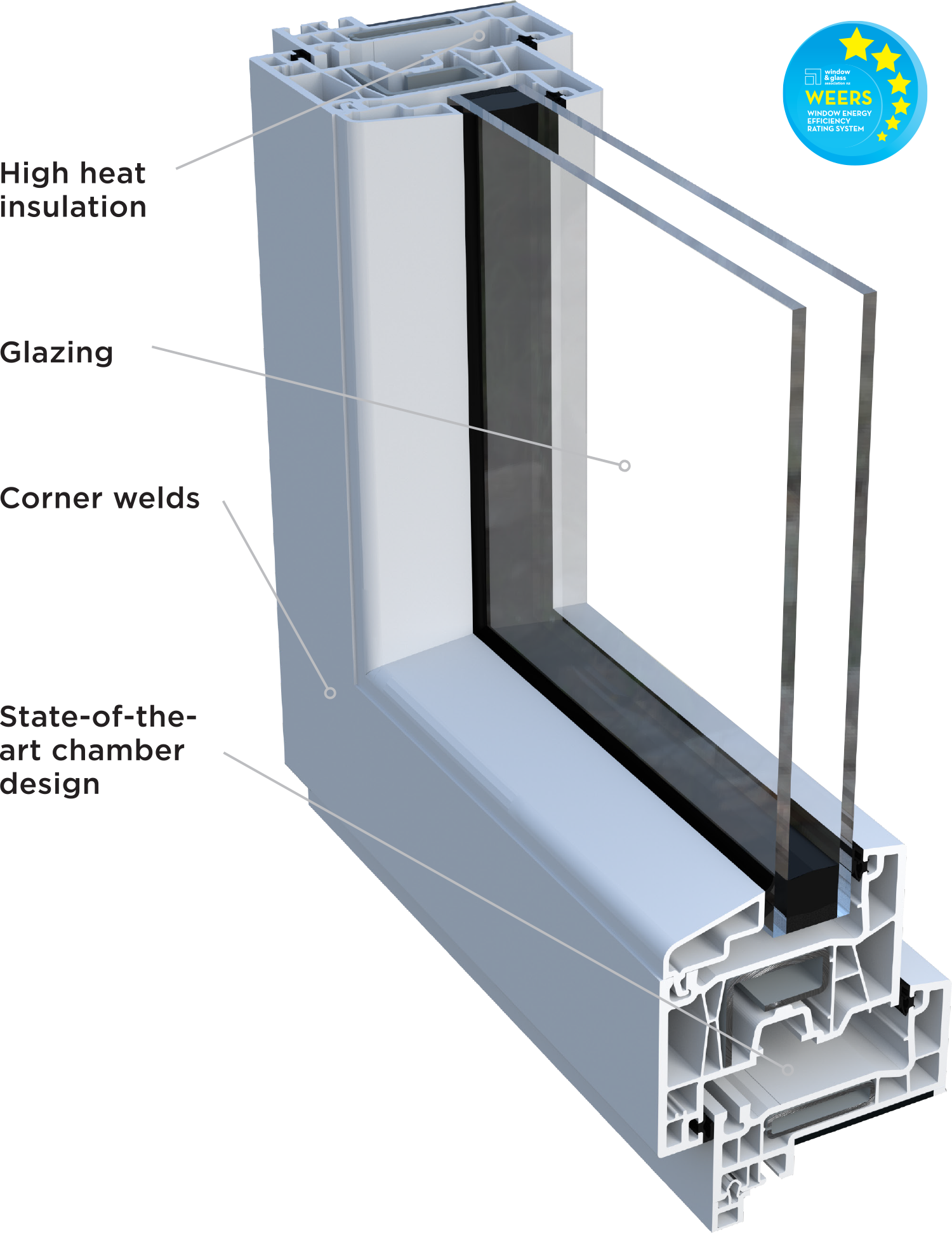 • Super thick profiles for maximum thermal insulation, high quality weather resistance, and strength in high wind zones